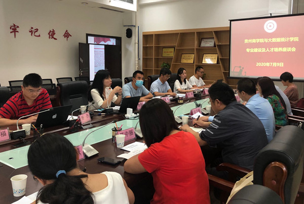 7月9日上午,贵州商学院图书馆馆长严帆、管理学院副院长曾方俊等一行七人到amjs澳金沙门就专业建设及人才培养情况进行调研。会议由amjs澳金沙门直属党支部书记鲁静芳主持。amjs澳金沙门副院长于桂海、大数据管理与应用教研室主任胡杰及全体教师参加会议。