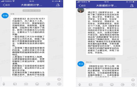 本次活动主要通过教职工线下自学文件、线上交流研讨的形式举行。教职工首先线下自学《国家安全法》《保守国家秘密法》《网络安全法》《国家情报法》等法律法规,增强安全教育理论知识。在认真学习文件后,4月17日全体教职工在OA群组开展了热烈的讨论和交流。