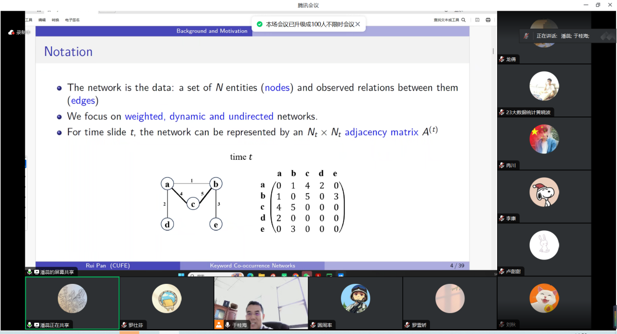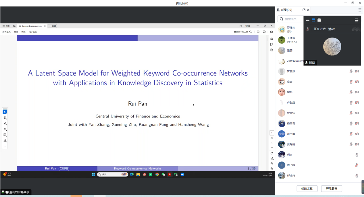 潘蕊教授的报告题目为《加权关键词共现网络的潜在空间模型及其在统计学知识发现中的应用》。报告着重介绍了一项重要创新成果,提出了一种用于动态关键词共现网络的潜在空间模型。该模型不仅适用于加权网络问题,还可以捕捉关键词共现网络的一些特征,有效解决了以往模型多针对无权网络而不适用于加权网络的问题,为关键词共现网络的研究提供了新的分析视角与方法。潘蕊教授分别从关键词共现网络及其邻接矩阵表示、研究数据的描述性统计、模型解释、模拟及实际数据分析等几方面进行了详细讲解。
