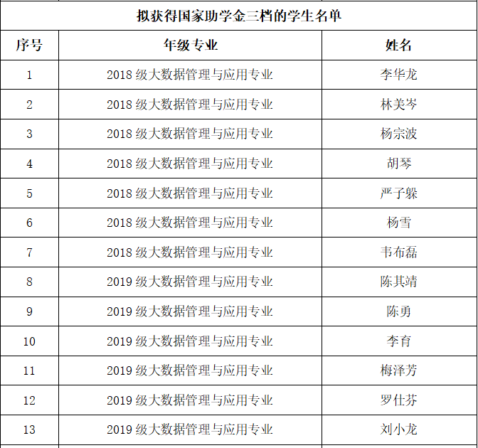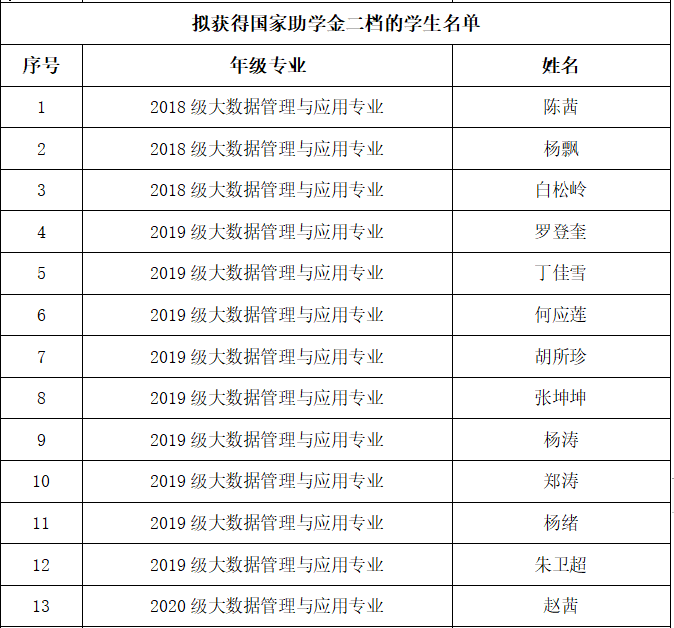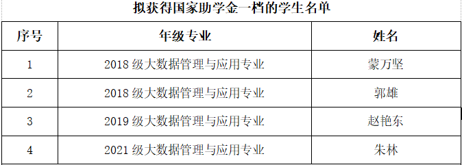 根据《贵州财经大学国家助学金实施管理办法》文件精神,结合《我院2021—2022学年国家助学金评选细则》,学院本着公平、公开、公正的原则开展了2021—2022学年国家助学金的评选工作,现评选工作已经结束,将评选结果进行公示: